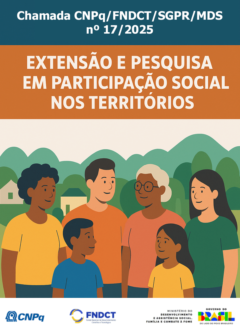 A Pró-Reitoria de Pesquisa e Extensão da UFCG informa que os(as) interessados(as) em participar da Chamada CNPq/FNDCT/SGPR/MDS nº 17/2025 deverão encaminhar suas propostas, via SEI, utilizando o tipo de processo “Administração: Comunicações, informações, Solicitações Eventuais”, para a PROPEX, até o dia 13/10/2025, para a emissão da Carta de Anuência.