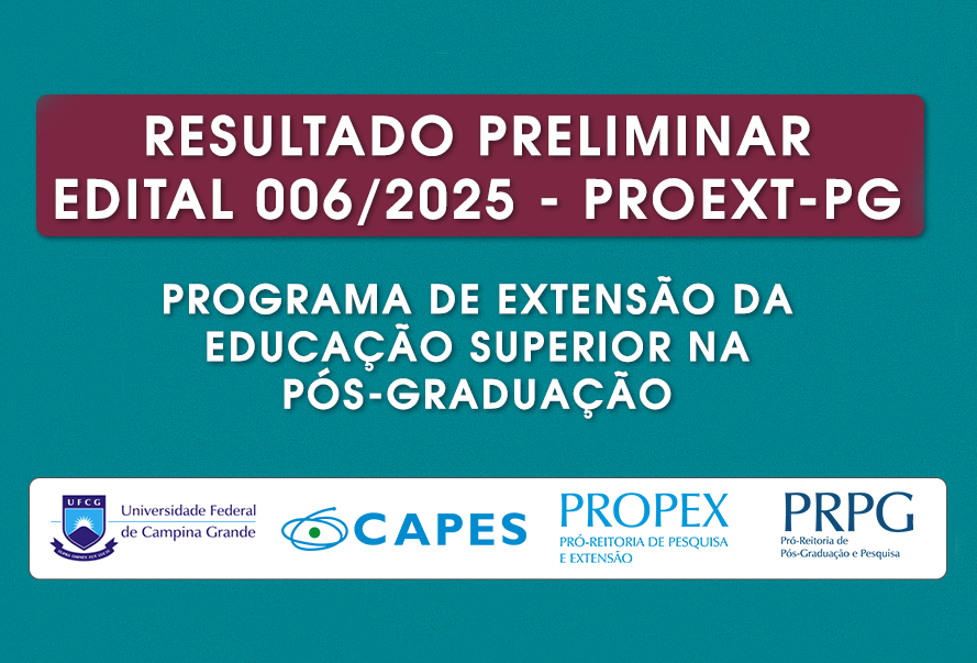 A Pró-Reitoria de Extensão e a Pró-Reitoria de Pós-Graduação e Pesquisa, por meio da Coordenação do PROEXT-PG da UFCG, tornam público, nesta data, a relação de propostas de...